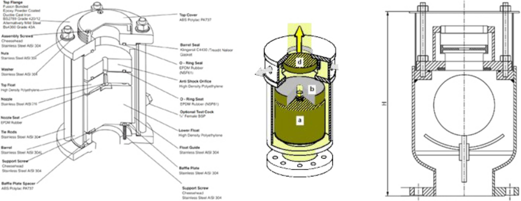 空氣閥有兩個(gè)圓柱形浮筒:大浮筒和小浮筒,分別負(fù)責(zé)低壓進(jìn)排氣與高壓微量排氣。小浮筒安裝在大浮筒的上方,且兩個(gè)浮筒均在主閥體內(nèi)空氣閥帶有緩沖盤片,確保平緩排氣,防止出現(xiàn)"氣堵"破壞的情況。緩沖片在經(jīng)歷高速排氣時(shí)所通過(guò)的面積以及小孔的數(shù)量可做調(diào)整。