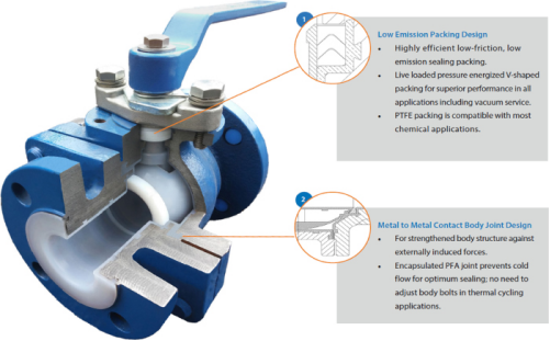 襯氟球閥也稱襯里球閥,采用內(nèi)村氟塑料方式,將耐腐蝕材料F46或F4內(nèi)村于閥體內(nèi),保證與各種強腐蝕介質(zhì)接觸的部分均為氟塑料,將腐蝕介質(zhì)與閥體材料隔離開,實現(xiàn)對生產(chǎn)過程中酸、堿等強腐蝕介質(zhì)的控制。